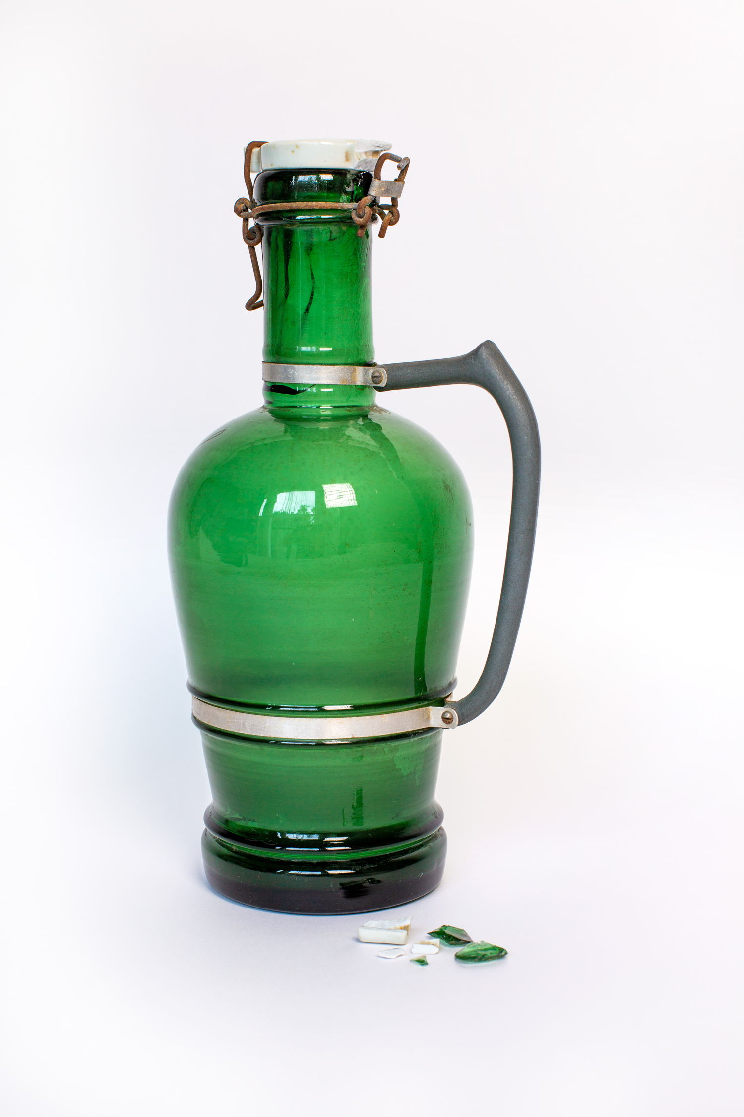 Bottles of this kind – also called growlers – were used to contain and transport beer. This 18th century example, which came from the aunt of the owner’s German grandmother, was recently knocked over, cracking the neck and lid.
